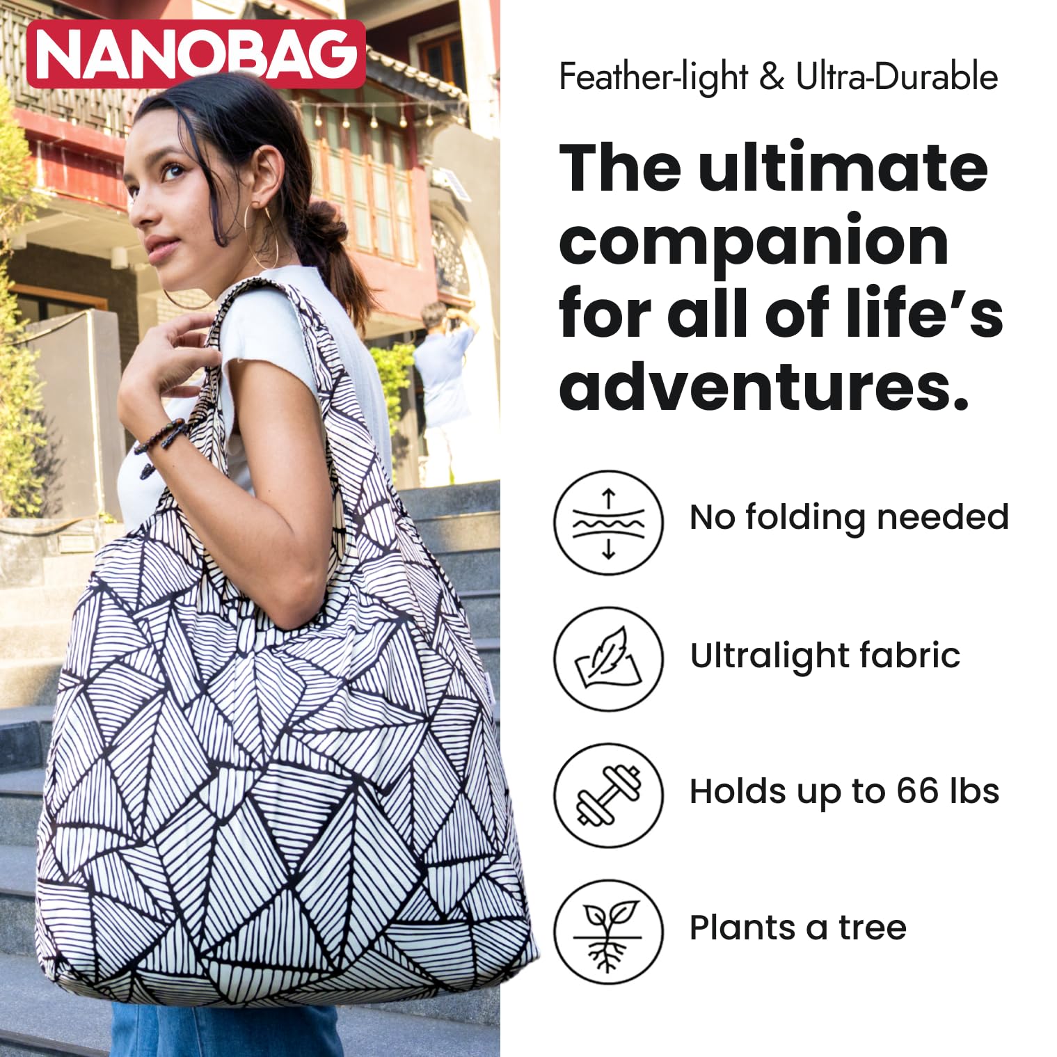 - THE NANOBAG STANDARD: Fits 19 liters and weighs only 0.85 oz (24 g), making it the ultimate ultralight travel tote for those on the go. The durable ripstop nylon practically disappears in your pocket and the triple-layered handles ensure comfort for all-day use.